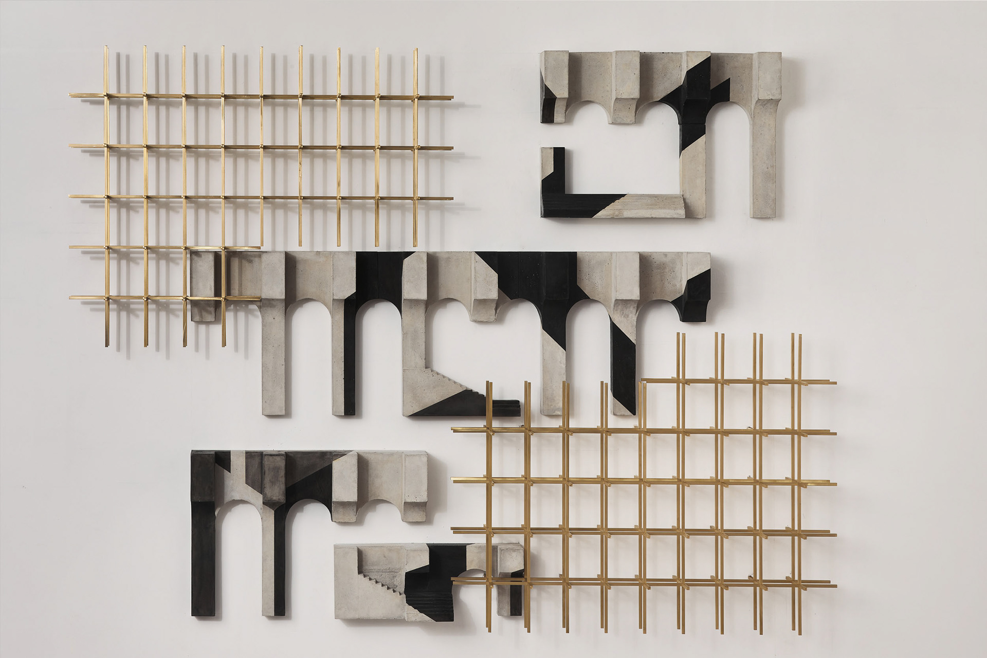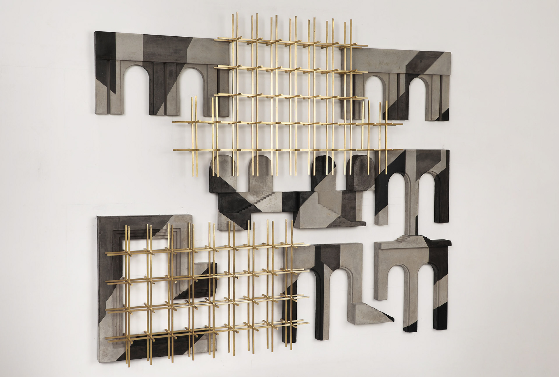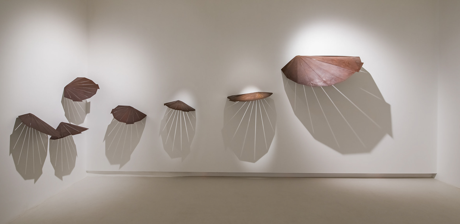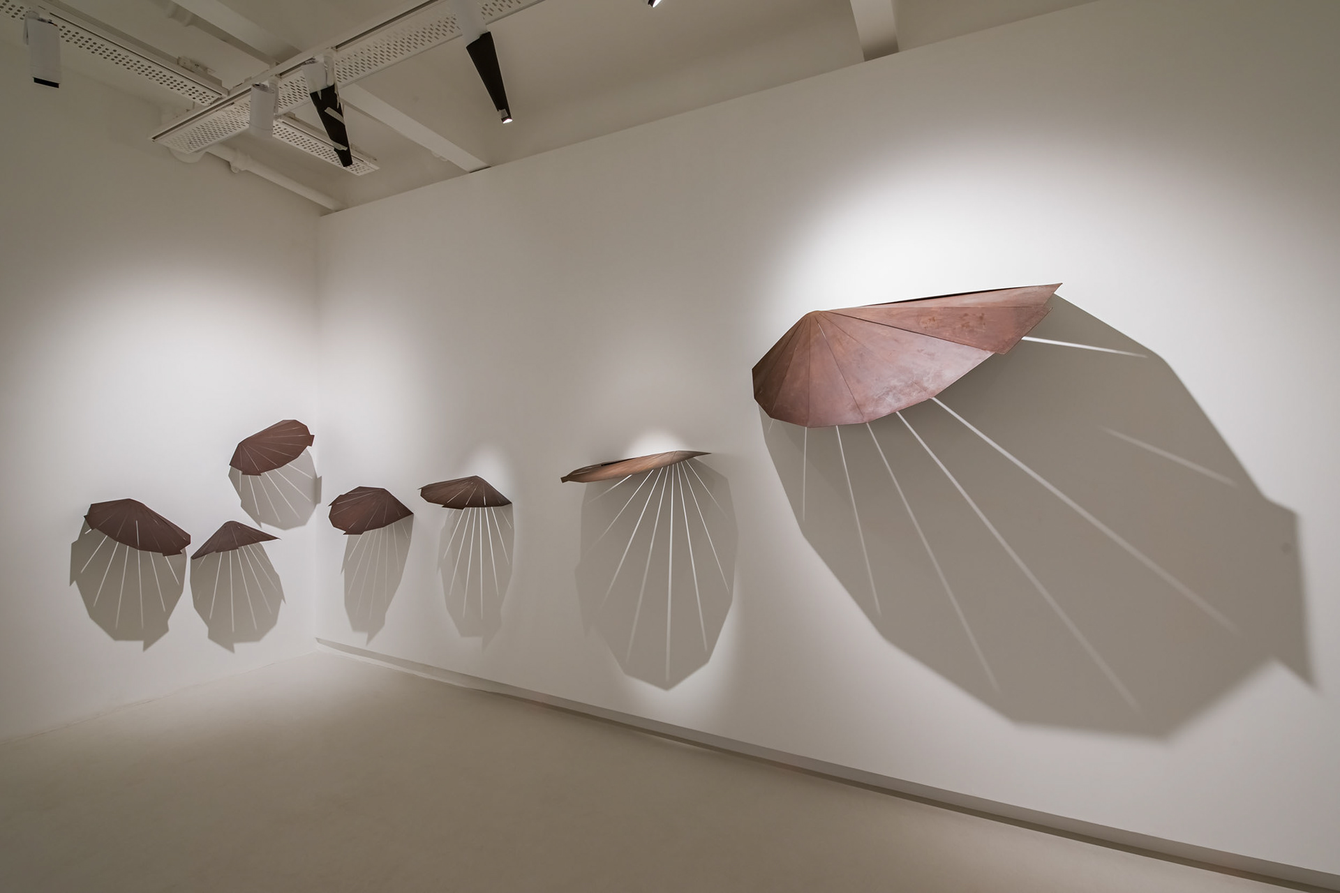A diverse collection of artistic sculptures, including hanging, suspended, and textured sculptures, displayed in various indoor and gallery settings.