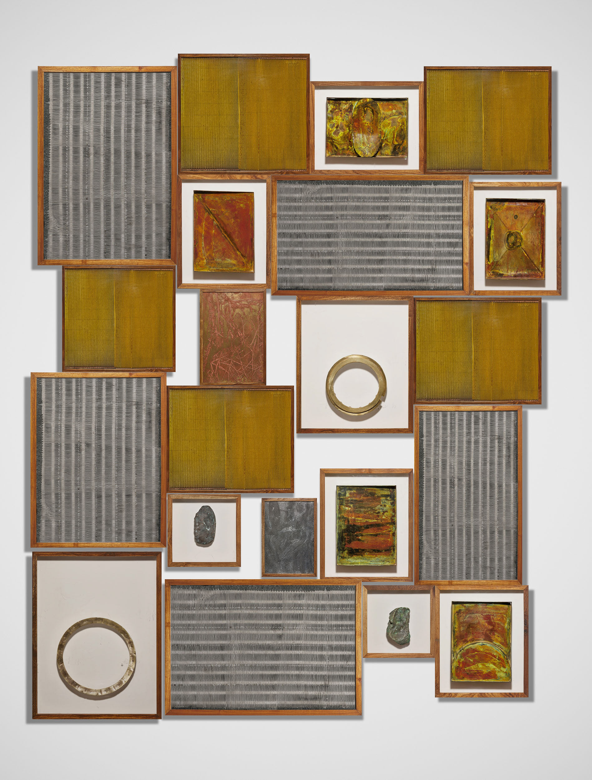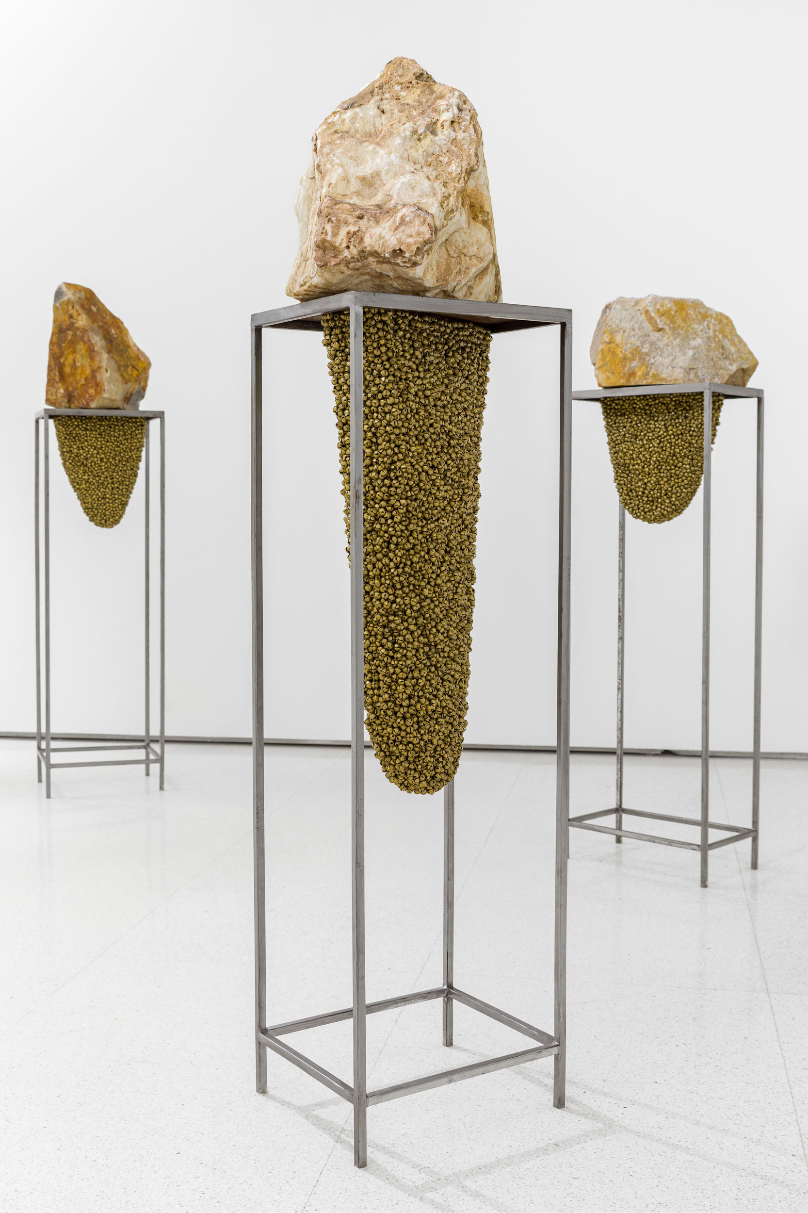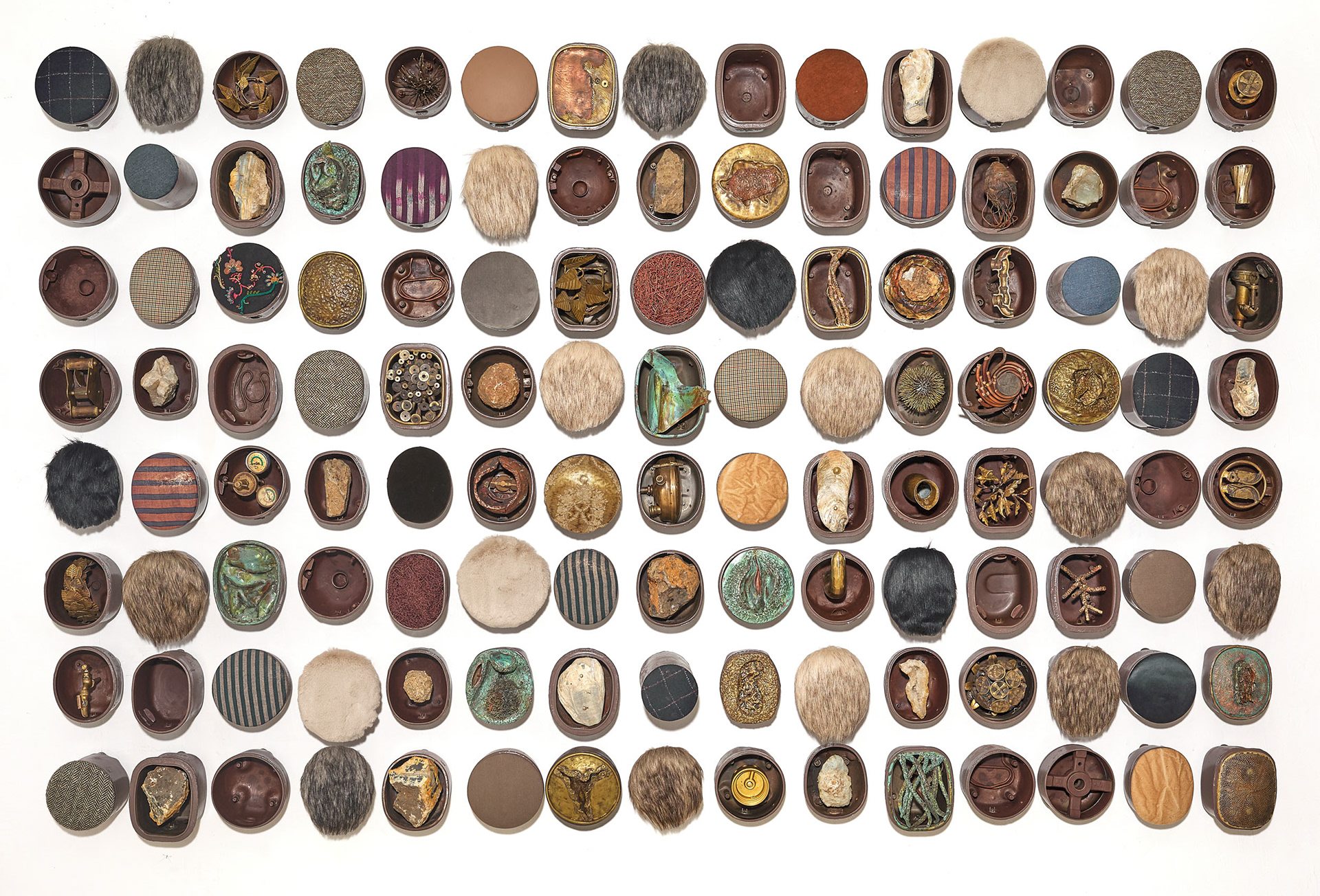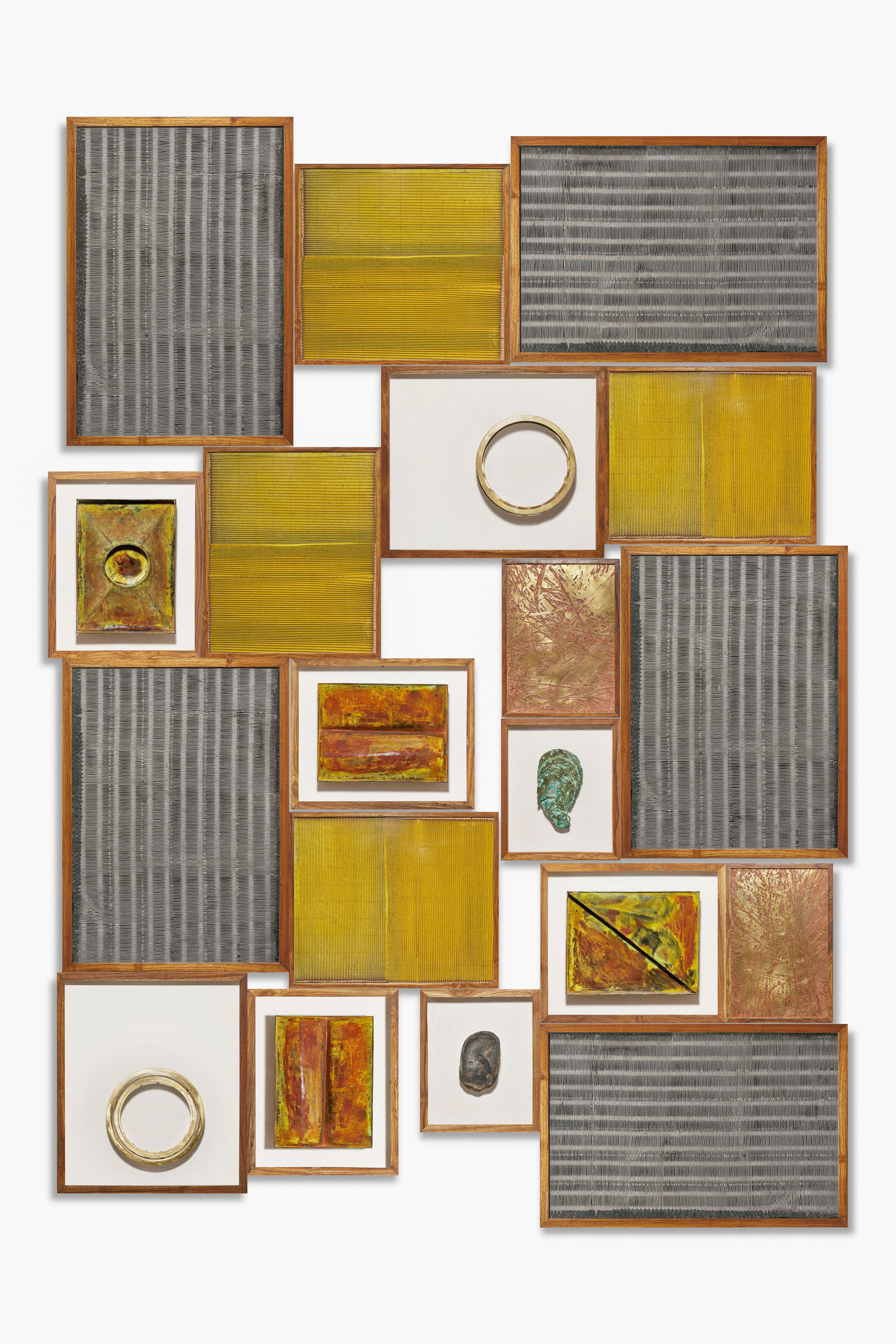 A diverse collection of artistic sculptures, including hanging, suspended, and textured sculptures, displayed in various indoor and gallery settings.